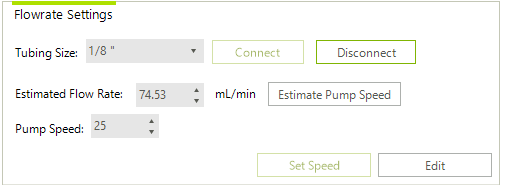 3. Select the Tubing size associated with the pump selected. Enter in a desired flowrate and click Estimate Pump Speed to automatically generate a speed that would be optimal to dispense the desired flow per minute. Next, click Set Speed.
