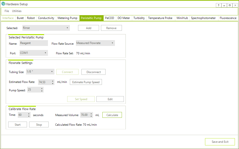 The flowrate of the peristaltic pump are configured in the Hardware → Hardware Configuration → Peristaltic Pump tab. The flowrate calibration feature is enabled once the Flow Rate Source is set to Measured Flowrate.