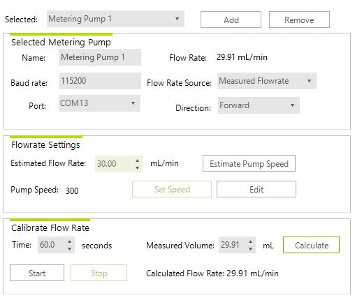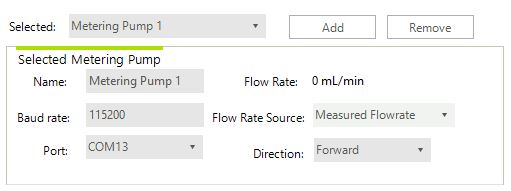 - If there are multiple metering pumps on your instrument, ensure the correct pump is selected from the drop down menu. Ensure the Flow Rate Source is Measured Flowrate.